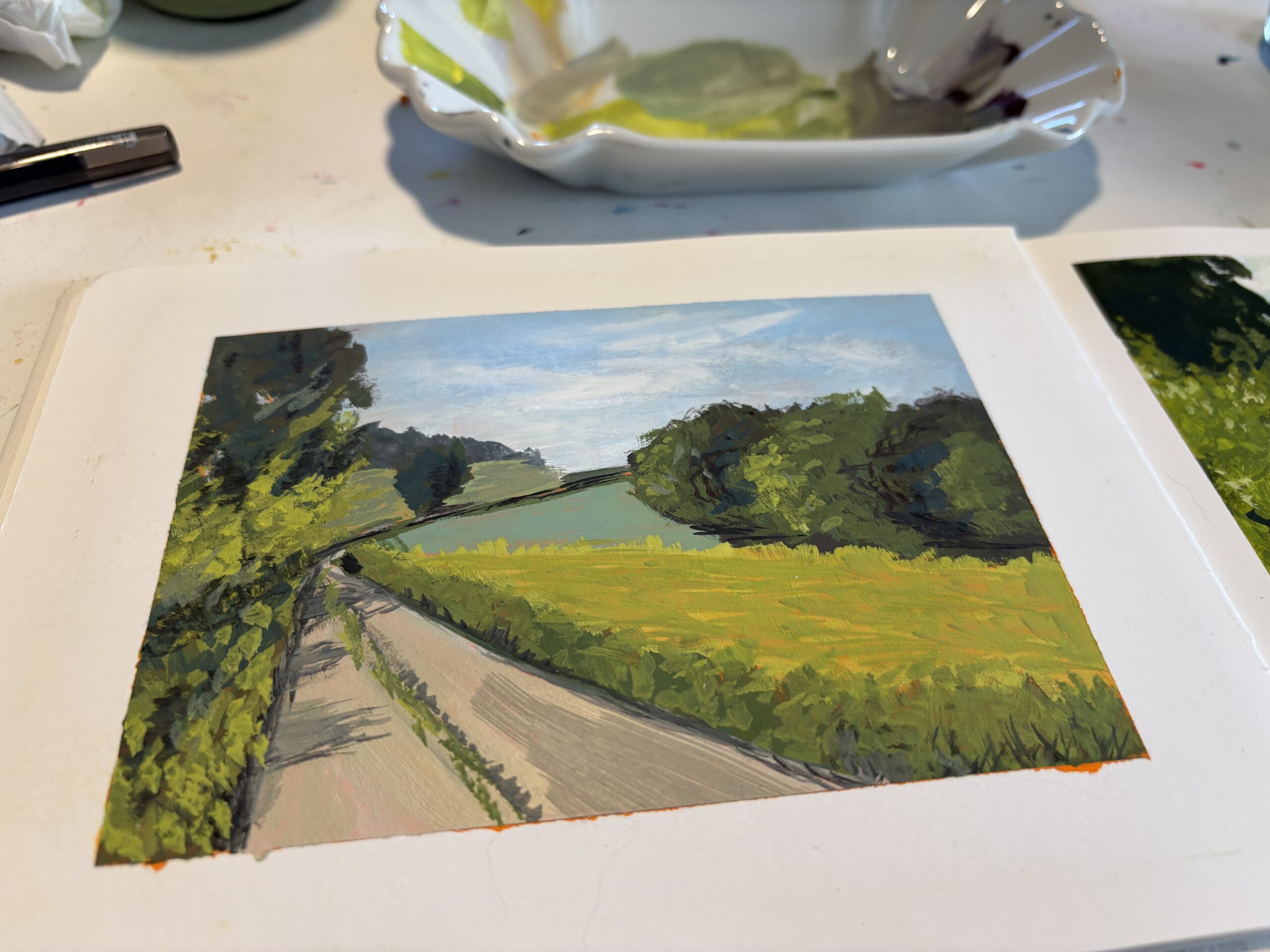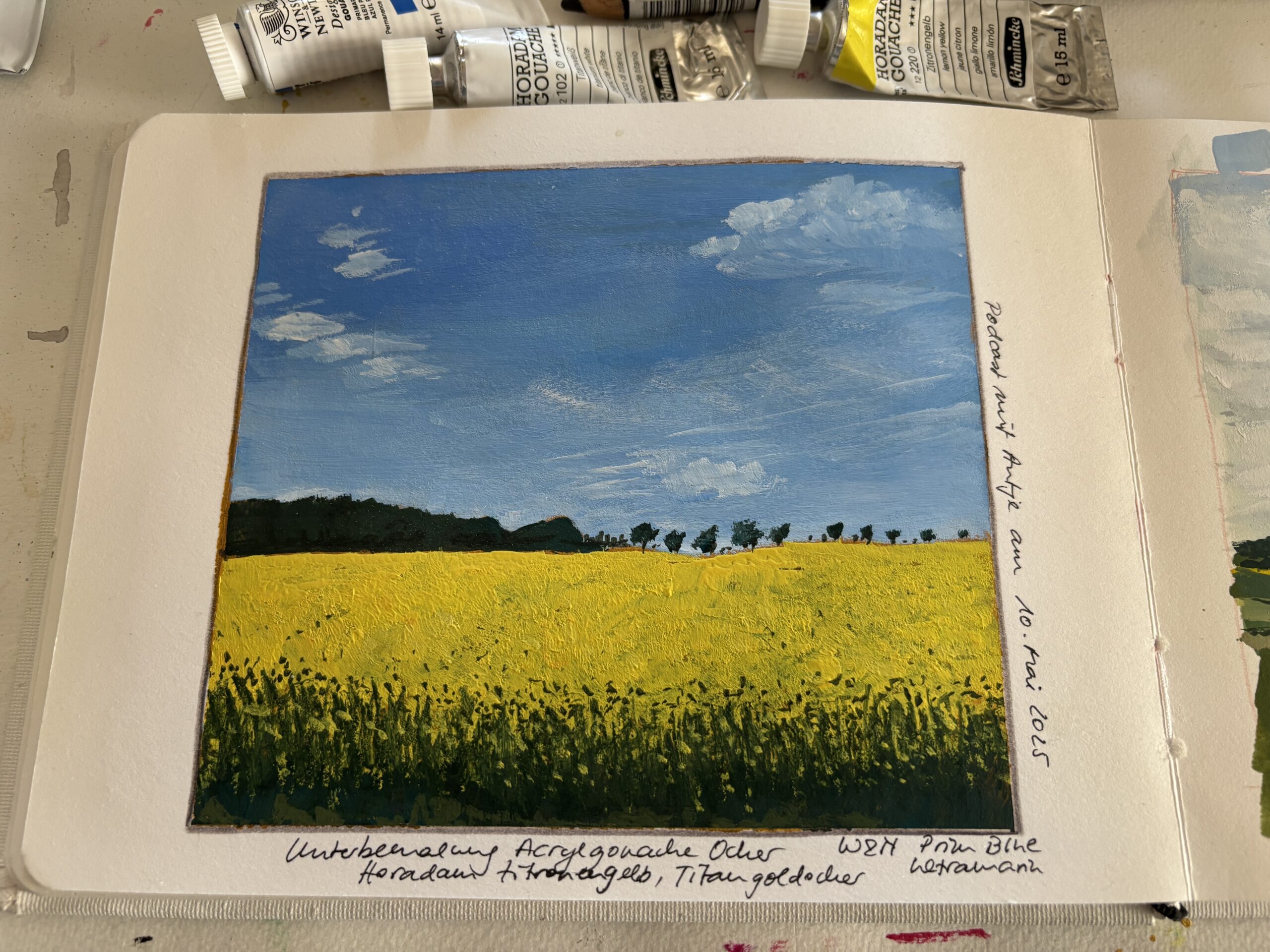 Die Schönheit dieser Landschaft in Bildern festzuhalten, begeistert mich immer wieder. Und ganz besonders gern tue ich das mit meiner Lieblingsfarbsorte Gouache. Sie ist so wunderbar sanft und eignet sich vielleicht gerade deshalb so prima für die sanfte gewellte Landschaft, in der ich aufgewachsen bin.