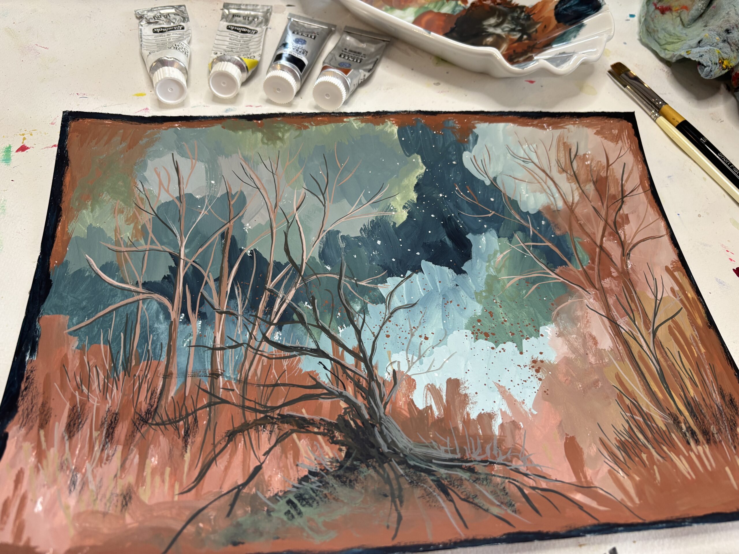 In diesem Gouache-Livekurs „Landschaft“ lade ich dich ein, dieser Verbindung nachzuspüren und ihr mit der sinnlichsten aller Farben, der Gouache, Ausdruck zu verleihen.