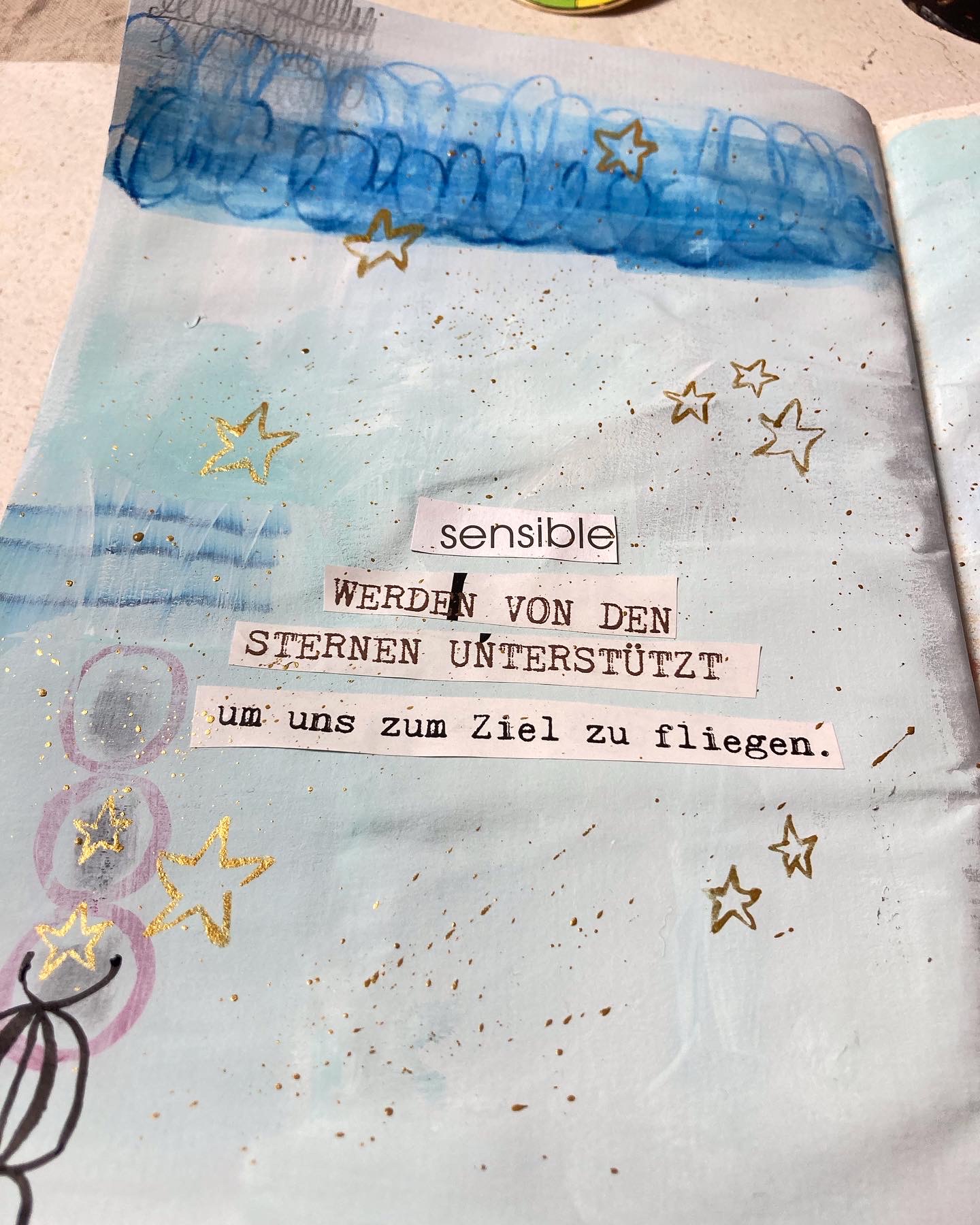 Die „Erlösung“ kam mit dem Kennenlernen von intuitiven Prozessen, die mich davon befreiten, etwas „richtig“ oder „falsch“ zu machen, was für eine Erleichterung! Das Cosmic Smashbooking ist weniger ein Art Journal als eine Methode, durch kreatives Spielen vom Kopf ins Bauchgefühl zu kommen. Man arbeitet nicht auf ein vorzeigbares, schönes Ergebnis hin, sondern kann sich selbst durch Schreiben, Malen und Collage-Kleben erforschen, einen Ausdruck finden und Erkenntnisse erhalten.