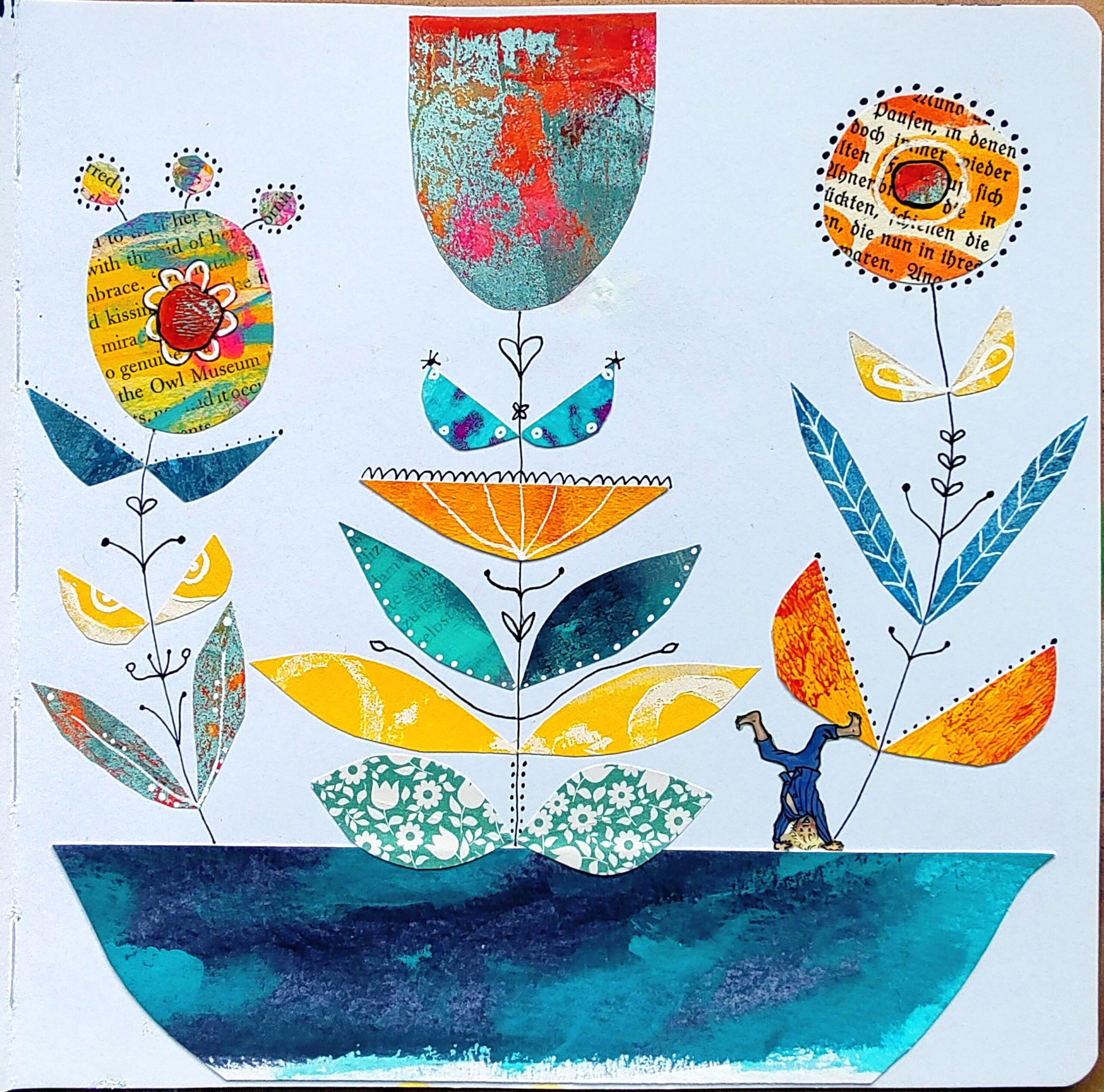 Im Jahreskurs 2026 werde ich in der Schnupperwoche eine Blume als Collage aus Papierschnipseln gestalten und im Haupttutorial einen Cosmic Smashbooking Prozess zeigen zum Thema „Mein innerer Garten“.